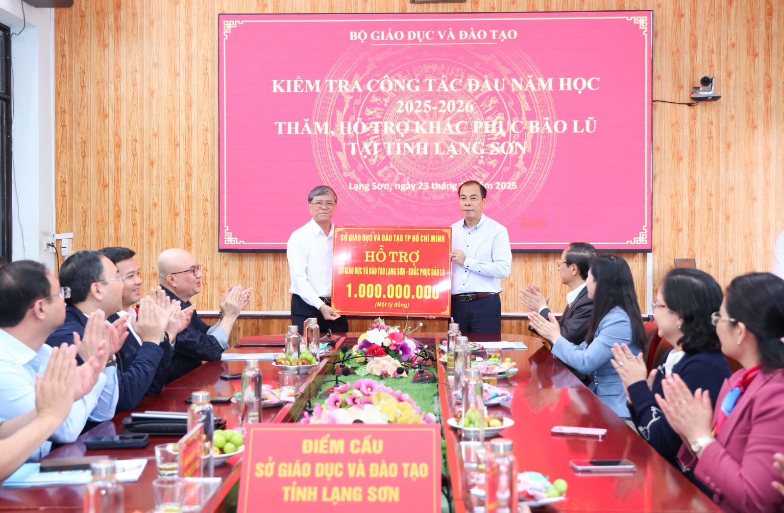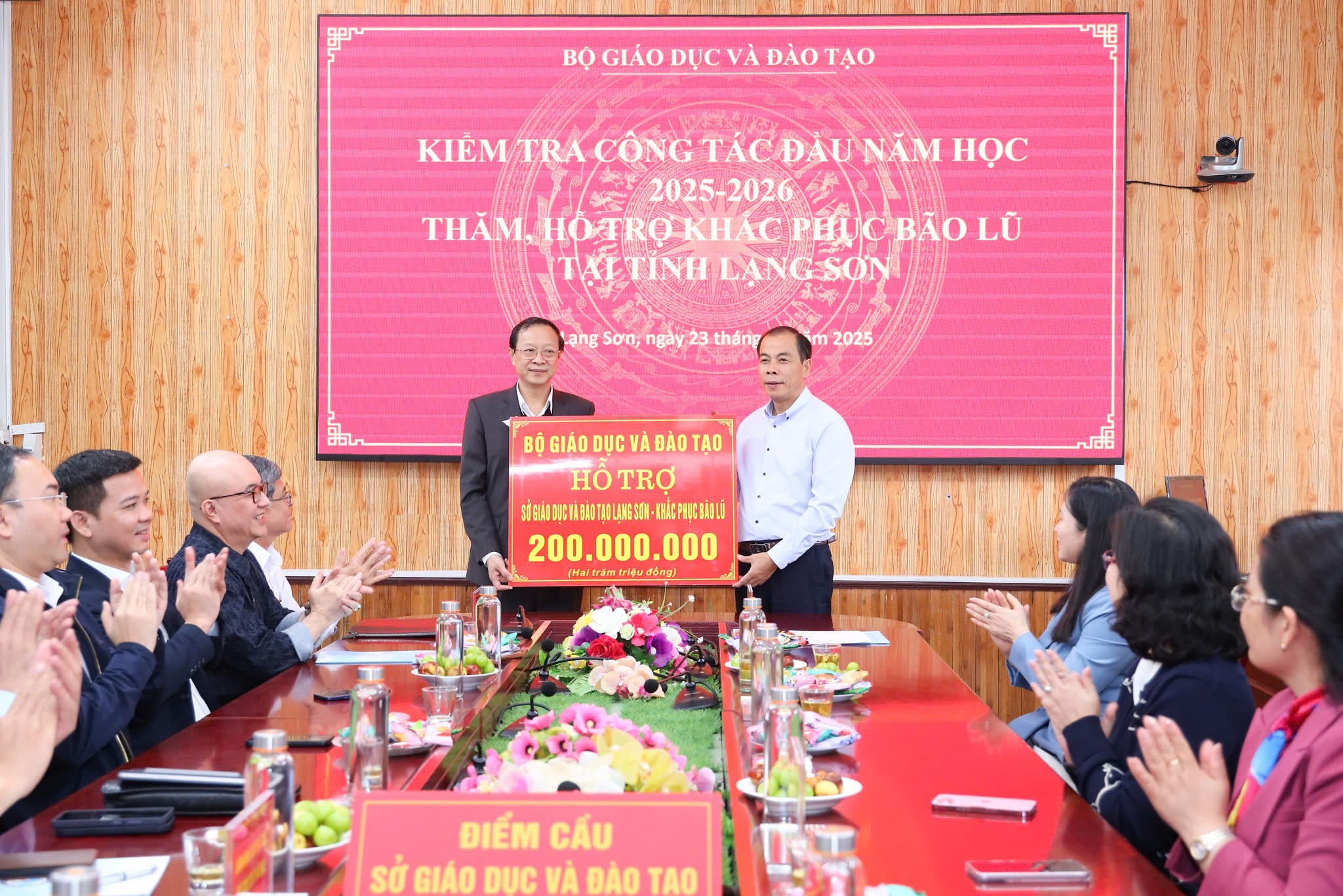 Tại buổi làm việc, Bộ GDĐT và các đơn vị đã trao 4,35 tỉ đồng hỗ trợ ngành Giáo dục tỉnh Lạng Sơn khắc phục hậu quả do thiên tai, bão lũ gây ra vừa qua.