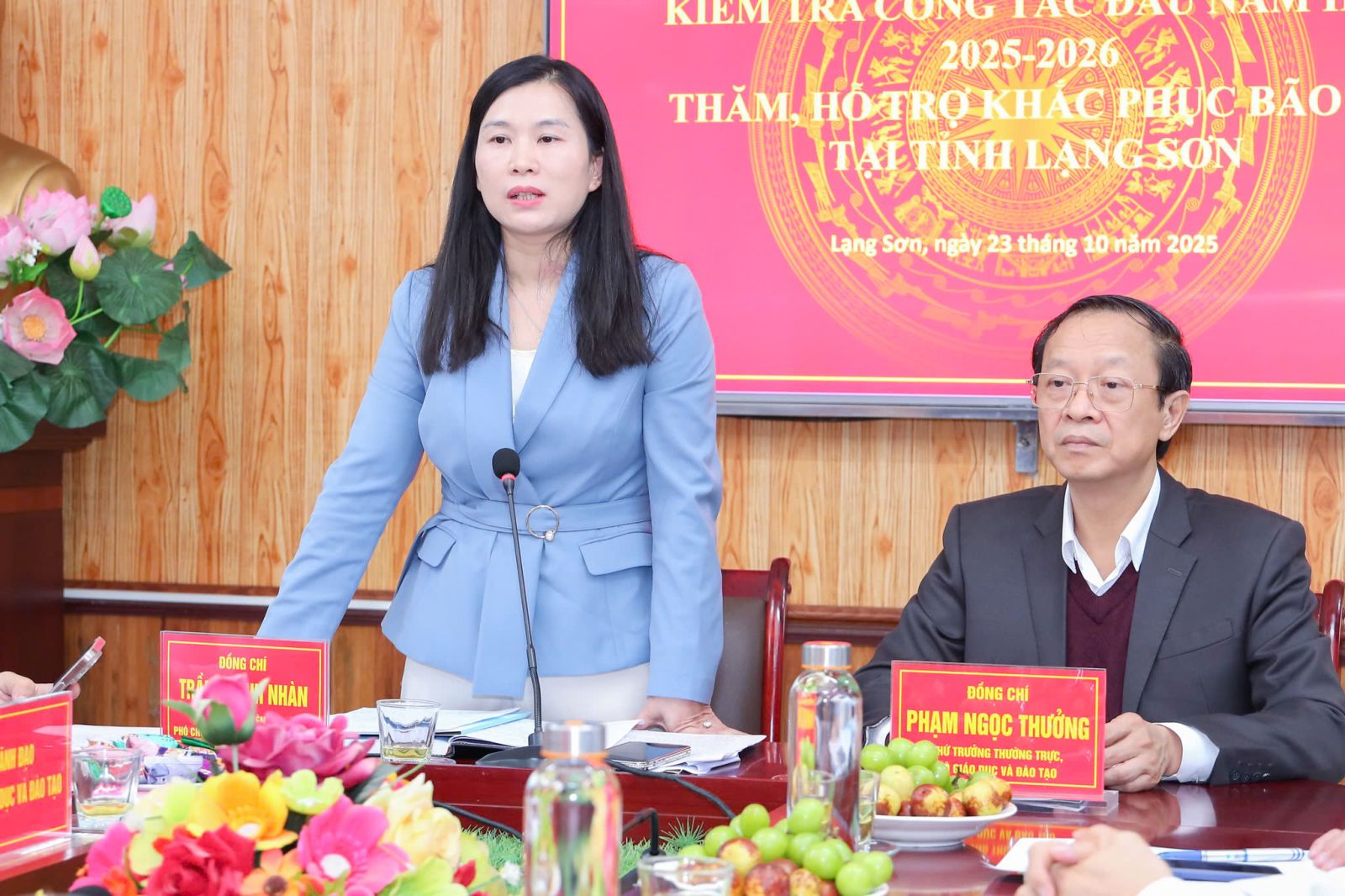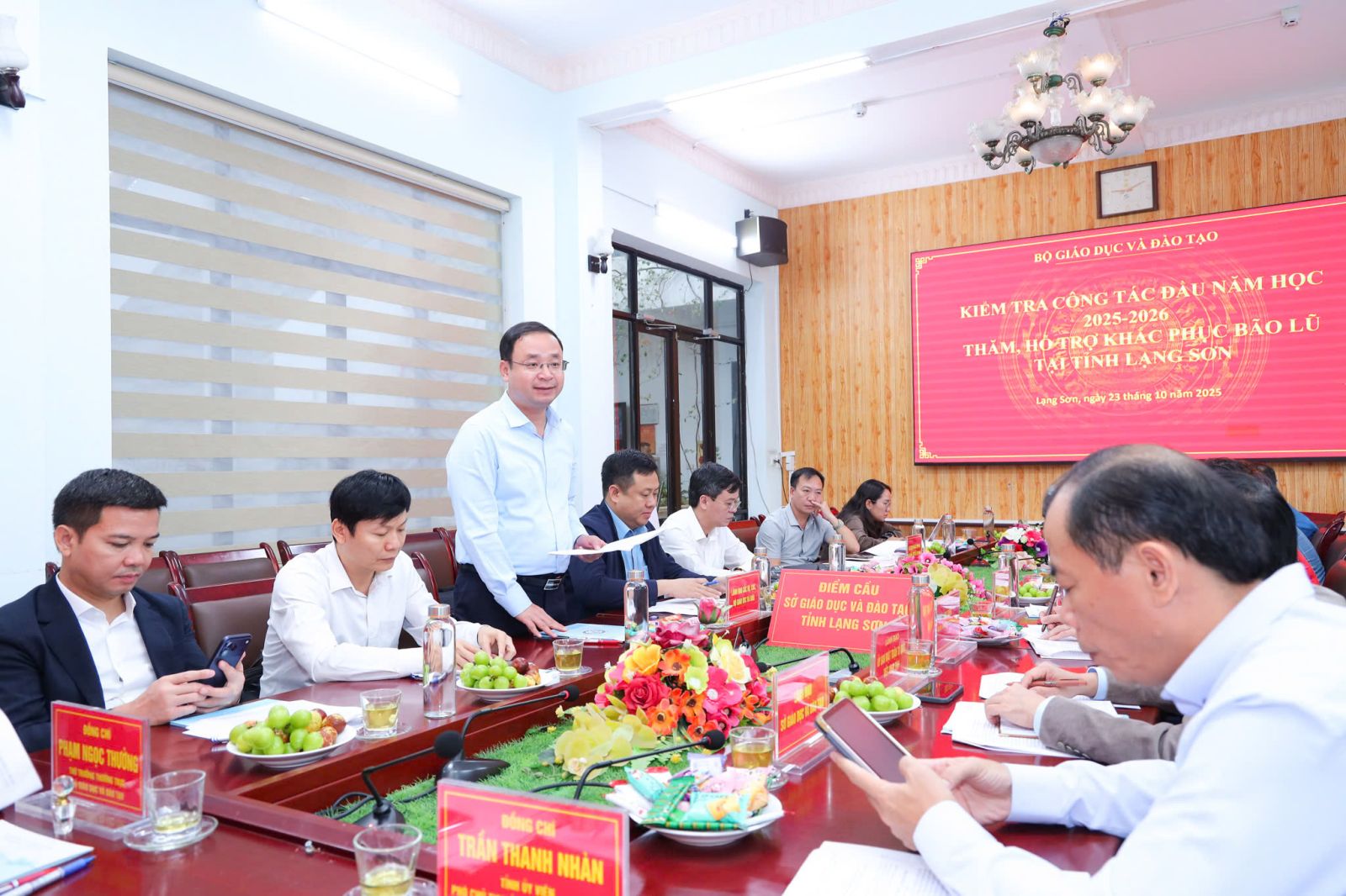 Ngày 23/10, tại Lạng Sơn, Bộ Giáo dục và Đào tạo (GDĐT) đã có buổi làm việc với ngành Giáo dục tỉnh, kiểm tra công tác đầu năm học 2025-2026 và khắc phục hậu quả thiên tai sau cơn bão số 11. Thứ trưởng Thường trực Phạm Ngọc Thưởng, Phó Chủ tịch Uỷ ban nhân dân tỉnh Lạng Sơn Trần Thanh Nhàn đồng chủ trì buổi làm việc.