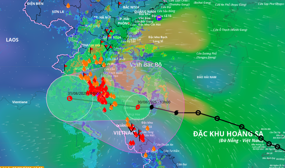 Đến 13h ngày 30/8, vị trí tâm bão ở khoảng 17,7 độ Vĩ Bắc - 107,5 độ Kinh Đông, trên vùng biển từ tỉnh Nghệ An đến thành phố Huế. Sức gió mạnh nhất vùng gần tâm bão mạnh cấp 8, giật cấp 10, cấp độ rủi ro thiên tai: cấp 3.