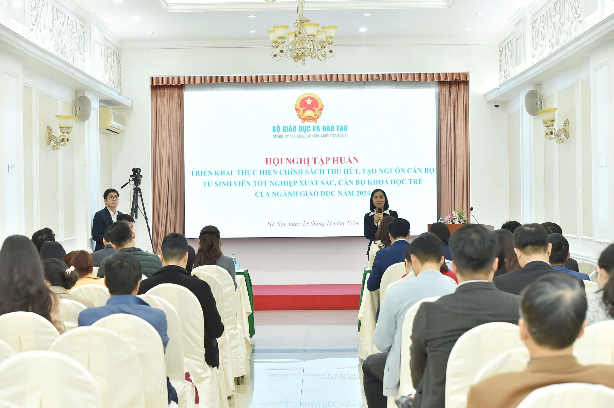 Ngày 28/11, Bộ Giáo dục và Đào tạo (GDĐT) tổ chức tập huấn triển khai thực hiện chính sách thu hút, tạo nguồn cán bộ từ sinh viên tốt nghiệp xuất sắc, cán bộ khoa học trẻ của ngành Giáo dục năm 2024. Hội nghị được tổ chức theo hình thức trực tiếp kết hợp trực tuyến.