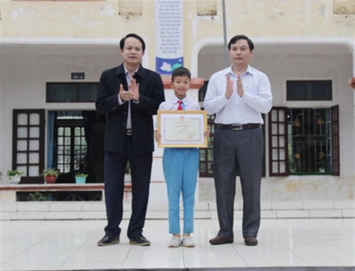 Sáng ngày 16/4, trong lễ chào cờ tại Trường Tiểu học Thịnh Lộc, lãnh đạo Sở GD&ĐT Hà Tĩnh đã trao bằng khen của Bộ trưởng Bộ GD&ĐT cho em Võ Hồng Hiếu vì hành động trả lại của rơi cho người đánh mất.