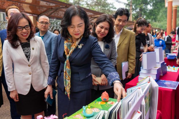 Thứ trưởng Ngô Thị Minh thăm quan gian hàng trưng bày các sản phẩm khởi nghiệp của sinh viên