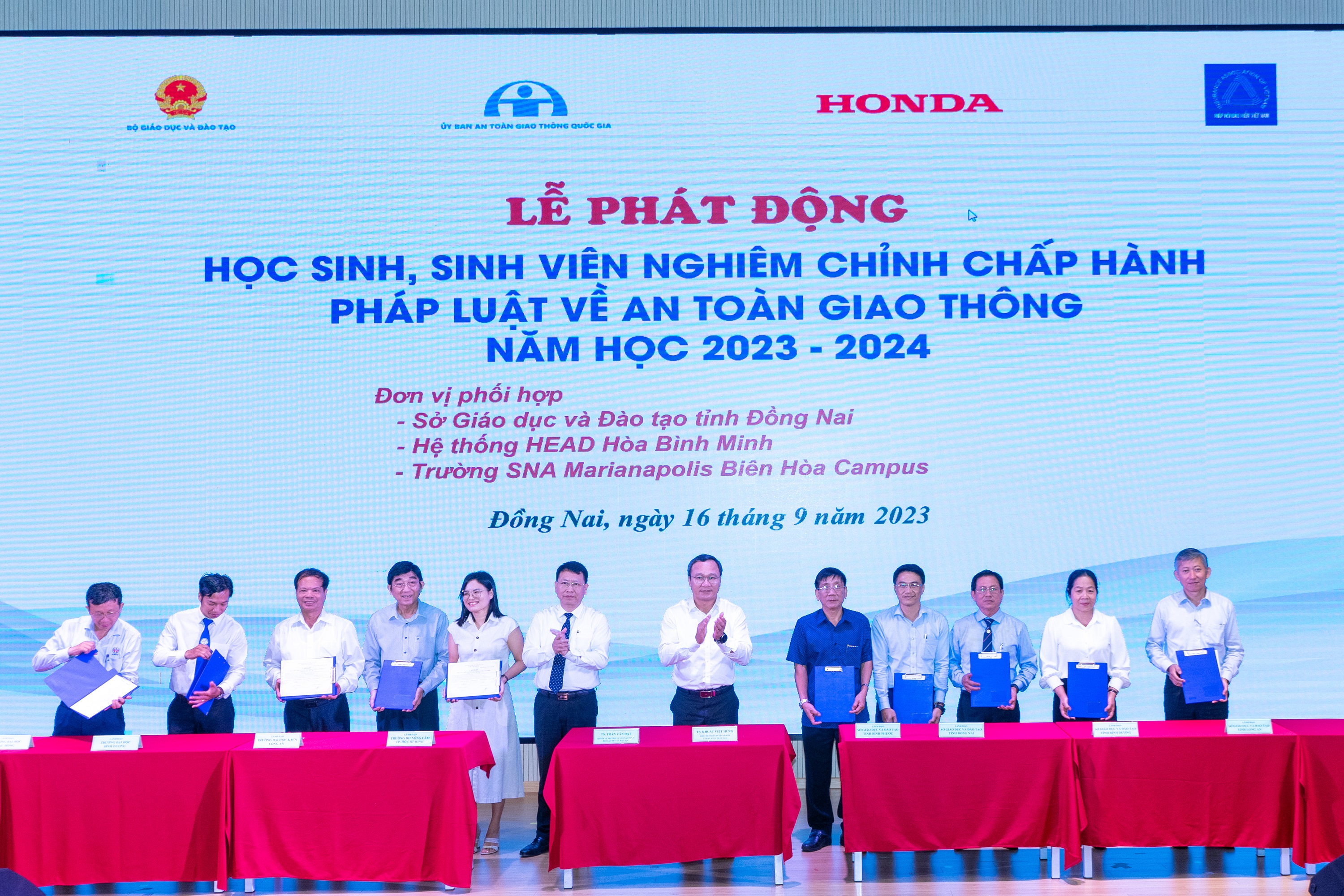 Tại lễ phát động, đại diện lãnh đạo của 5 Sở GDĐT và 5 trường đại học trên địa bàn TP. Hồ Chí Minh và các tỉnh miền Đông Nam bộ đã ký cam kết với Bộ GDĐT, Ủy ban An toàn giao thông quốc gia về việc tăng cường triển khai thực hiện công tác giáo dục an toàn giao thông năm học 2023-2024.