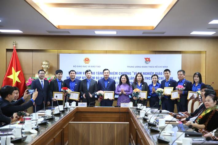 Nhân dịp này, Bộ GDĐT đã trao tặng Kỷ niệm chương “Vì sự nghiệp giáo dục” cho 9 đồng chí cán bộ của Trung ương Đoàn vì các đóng góp hiệu quả, góp phần vào việc thực hiện đổi mới căn bản, toàn diện giáo dục và đào tạo, nhất là sự nghiệp giáo dục thế hệ trẻ trong thời gian qua.
