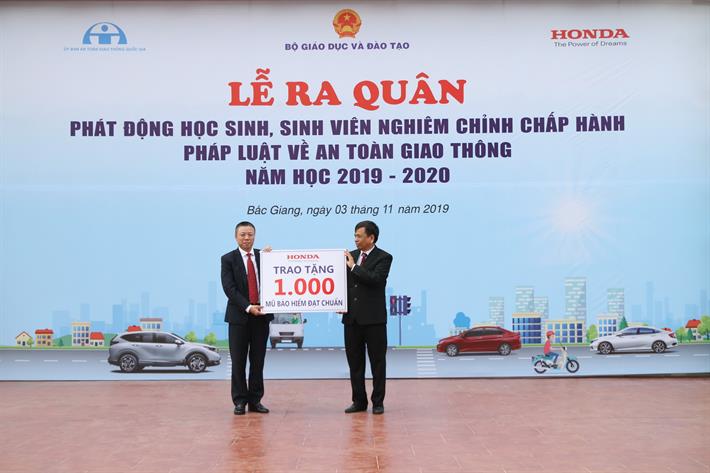 Nhân dịp này, Công ty Honda Việt Nam trao tặng 1.000 mũ bảo hiểm đạt chuẩn cho HSSV trên địa bàn tỉnh Bắc Giang nhằm hưởng ứng chiến dịch vận động hỗ trợ mũ bảo hiểm “Trọn nghĩa đồng bào, ấm tình cha mẹ”.