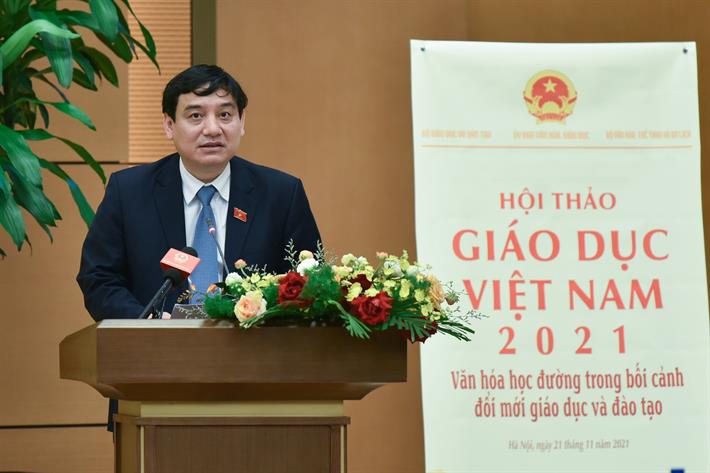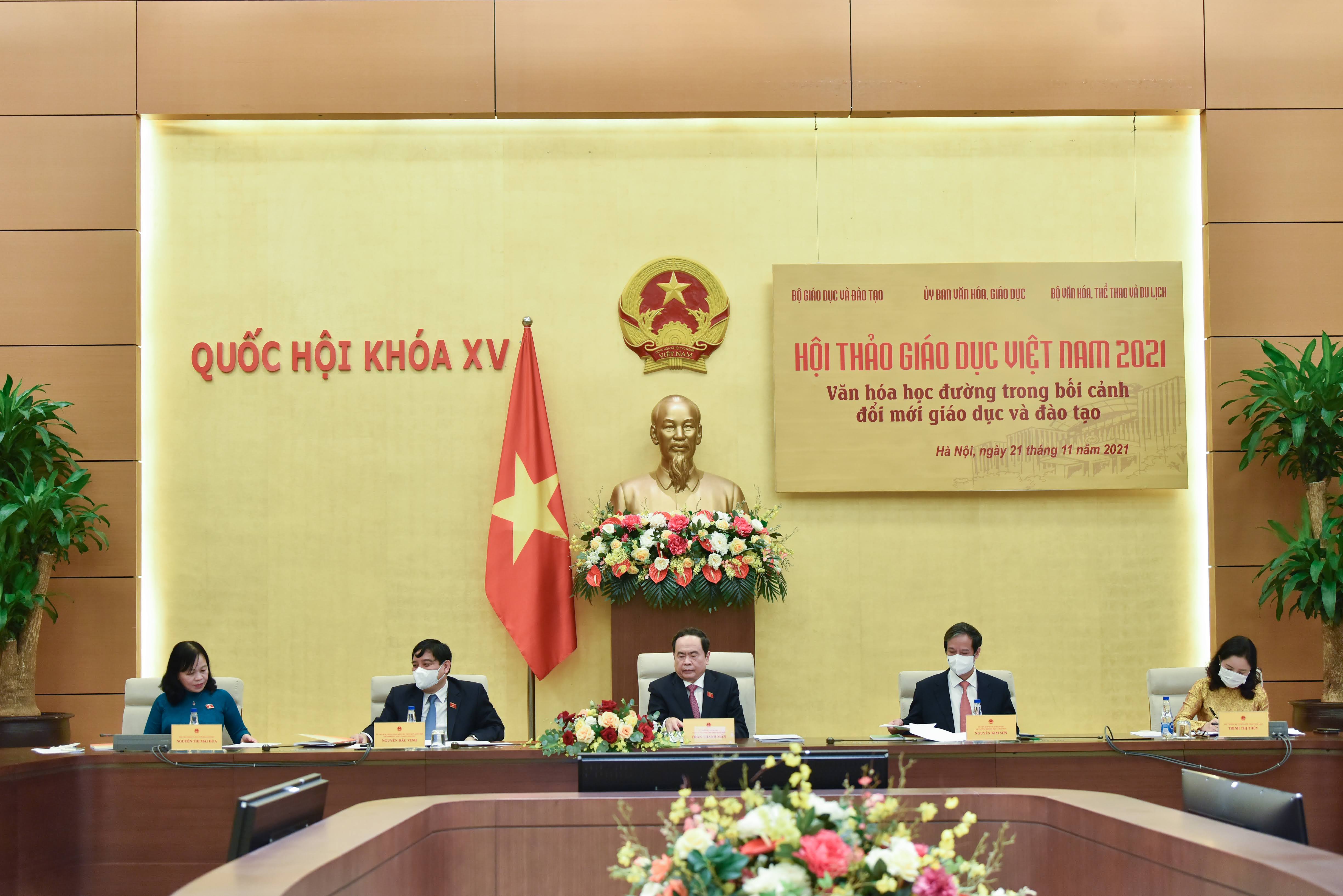 Hội thảo do Ủy ban Văn hóa, Giáo dục (VHGD) của Quốc hội phối hợp với Bộ Giáo dục và Đào tạo (GDĐT), Bộ Văn hóa, Thể thao và Du lịch tổ chức ngày 21/11. Dự Hội thảo có Phó Chủ tịch Thường trực Quốc hội Trần Thanh Mẫn; Chủ nhiệm Ủy ban VHGD của Quốc hội Nguyễn Đắc Vinh; Bộ trưởng Bộ GDĐT Nguyễn Kim Sơn; cùng lãnh đạo Ủy ban VHGD của Quốc hội, Bộ GDĐT, Bộ Văn hóa, Thể thao và Du lịch, cùng các chuyên gia, nhà khoa học, nhà giáo, nhà quản lý đến từ viện nghiên cứu, Sở GDĐT, cơ sở giáo dục và đào tạo trên toàn quốc.