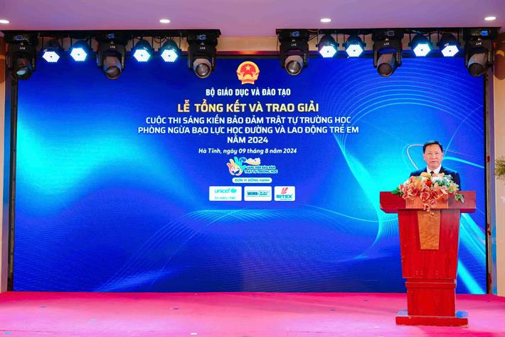 Phát biểu tại buổi lễ, ông Trần Văn Đạt - Vụ trưởng Vụ Giáo dục Chính trị và Công tác học sinh sinh viên cho biết: Cuộc thi “Sáng kiến bảo đảm trật tự trường học về phòng ngừa bạo lực học đường và lao động trẻ em” năm 2024 do Bộ GDĐT phát động là một trong nhiều giải pháp, hình thức mà toàn ngành đang quyết tâm chỉ đạo việc giáo dục toàn diện cho học sinh theo tinh thần Nghị quyết số 29 về đổi mới căn bản, toàn diện giáo dục và đào tạo. Thông qua cuộc thi nhằm tăng cường các giải pháp phòng, chống bạo lực học đường, lao động trẻ em, bảo đảm an ninh, an toàn trường học.