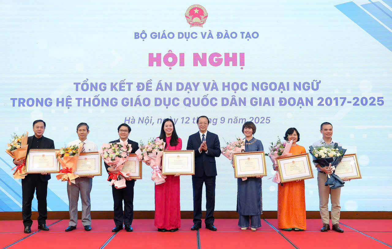 Tại hội nghị, Thứ trưởng Thường trực Phạm Ngọc Thưởng cũng đã trao tặng Bằng khen của Bộ trưởng Bộ GDĐT cho các đơn vị, cá nhân đã có thành tích xuất sắc trong việc triển khai thực hiện đề án dạy và học ngoại ngữ trong hệ thống giáo dục quốc dân giai đoạn 2017 – 2025.