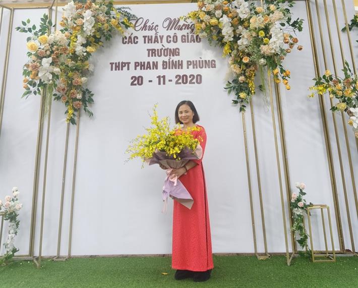 Cô Ngô Thị Thanh Bình bên các em học trò của mình tại Trường THPT Phan Đình Phùng