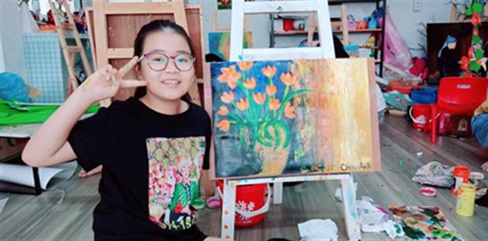 Em Hoàng Châu Anh bên bức tranh do mình tự vẽ