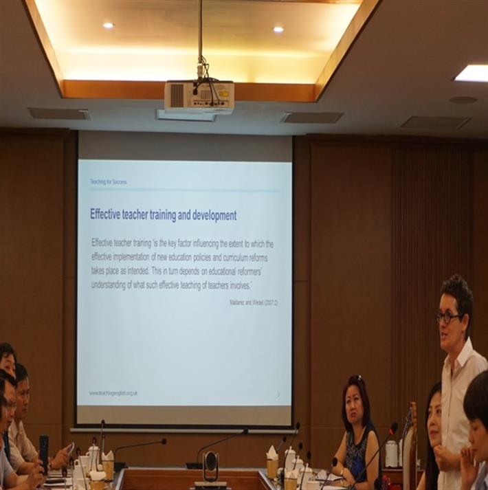 Chia sẻ kinh nghiệm triển khai bồi dưỡng đội ngũ giáo viên tiếng Anh thành công tại Thái Lan và 4 tỉnh/ thành phố của Việt Nam (Nam Định, Cần Thơ, Bắc Giang và Lạng Sơn) theo Chương trình Teaching for Success, bà Sadie Maddocks, cố vấn đào tạo cao cấp của Hội đồng Anh cho biết: “Chương trình bồi dưỡng của chúng tôi có thời lượng từ 60 đến 100 giờ bao gồm nhiều nội dung thực tiễn hơn lý thuyết. Chúng tôi cũng khuyến khích xây dựng văn hóa phát triển chuyên môn thường xuyên trong nhà trường thông qua hoạt động giảng dạy mẫu và dự giờ của giảng viên Hội đồng Anh với các em học sinh trong lớp học thực tế”. Theo Chương trình Teaching for Success, giảng viên của Hội đồng Anh sẽ trực tiếp làm việc cùng các giáo viên để tìm hiểu những khó khăn của các thầy cô trong công việc, từ đó thiết kế nội dung bồi dưỡng phù hợp. Các giảng viên của Hội đồng Anh sẽ dạy mẫu trên lớp học thực tế, dự giờ dạy trên lớp học thực tế áp dụng kỹ thuật hay phương pháp giảng dạy mới được học của các giáo viên phổ thông để cùng thảo luận, rút kinh nghiệm giúp cho việc giảng dạy tiếng Anh trên lớp học thật hiệu quả. Theo ông Bùi Văn Khiết, Sở Nam Định đã khảo sát học sinh được học với những giáo viên được Hội đồng Anh bồi dưỡng theo Chương trình Teaching for Success, tỷ lệ học sinh thích học môn tiếng Anh tăng trên 40% so với trước.
