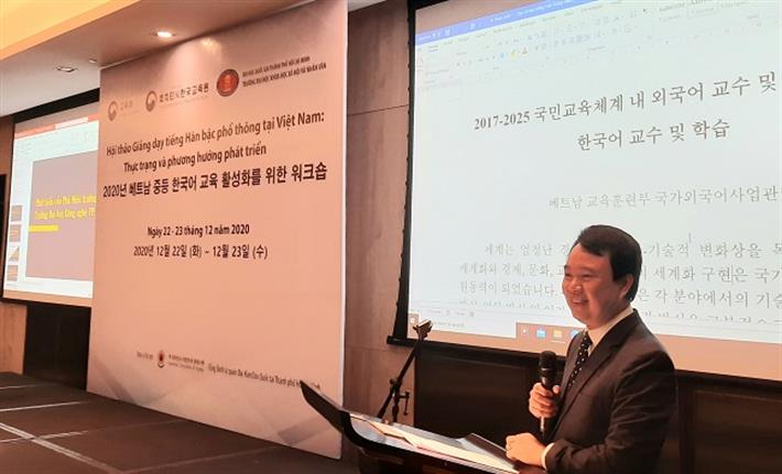 Phát biểu khai mạc Hội thảo bà Ko Ji Hyung – Giám đốc Trung tâm Ngôn ngữ tiếng Hàn tại TP.HCM cho biết: Đến thời điểm hiện tại, Bộ Giáo dục Hàn Quốc đang điều hành và quản lí 43 Viện Giáo dục tại 19 quốc gia, bao gồm cả Trung tâm Ngôn ngữ tiếng Hàn tại Hà Nội và Malaysia được thành lập vào tháng 12/2020.