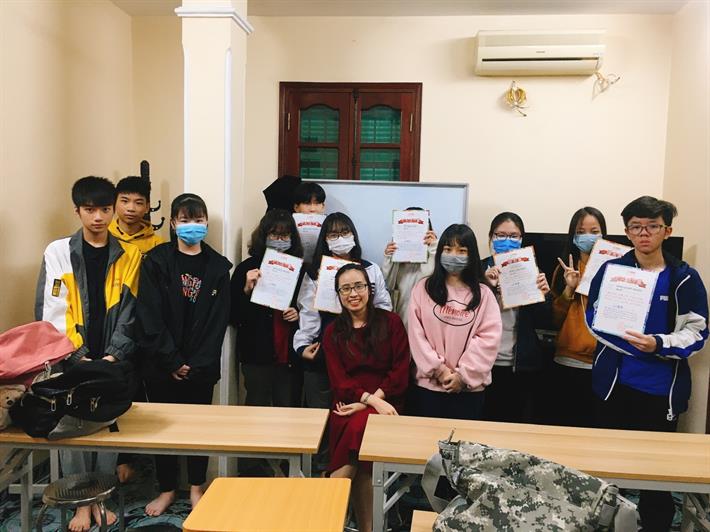 Cô Nguyễn Bảo Ly (váy đỏ) chụp ảnh cùng học viên tại trung tâm. Ảnh: NVCC