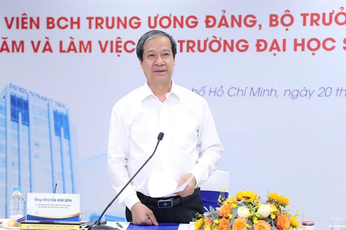 Phát biểu kết luận buổi làm việc, Bộ trưởng Nguyễn Kim Sơn đánh giá cao những thành tích Trường ĐHSPKT TP.HCM đã đạt được qua nhiều thế hệ. Nhận định đây là một trường sư phạm kỹ thuật then chốt của ngành, Bộ trưởng khẳng định luôn ủng hộ mạnh mẽ những chủ trương, cách làm đúng đắn, sáng tạo của nhà trường.
