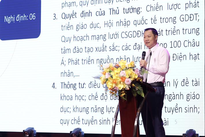 Vụ trưởng Vụ Giáo dục đại học Nguyễn Tiến Thảo báo cáo tại hội nghị