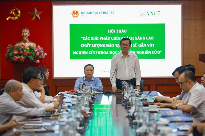 Hoạt động nghiên cứu khoa học trong các cơ sở GDĐH gắn bó mật thiết với công tác đào tạo, đặc biệt là đào tạo tiến sĩ. “Chúng ta mong muốn đào tạo tiến sĩ là đào tạo nhân tài, tinh hoa, nên phải đảm bảo chất lượng đầu ra. Các trường có trách nhiệm nâng cao chất lượng đào tạo tiến sĩ, xây dựng các nhóm nghiên cứu trong trường, từ đó xây dựng uy tín thương hiệu của trường” - Thứ trưởng nói.