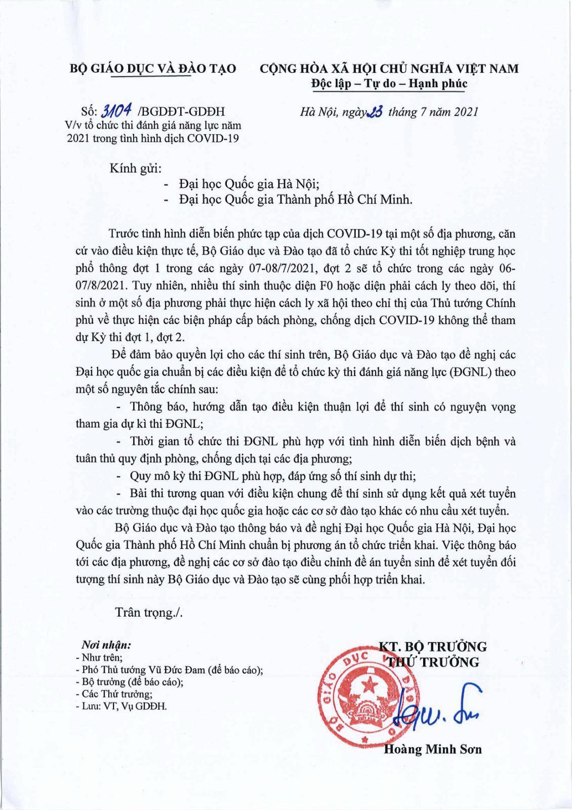 Thứ trưởng Bộ Giáo dục và Đào tạo (GDĐT) Hoàng Minh Sơn vừa ký công văn gửi Đại học Quốc gia Hà Nội và Đại học Quốc gia Thành phố Hồ Chí Minh về việc tổ chức thi đánh giá năng lực năm 2021 trong tình hình dịch COVID-19.