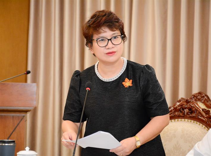 Vụ trưởng Vụ Giáo dục Đại học Nguyễn Thu Thủy báo cáo tại cuộc họp