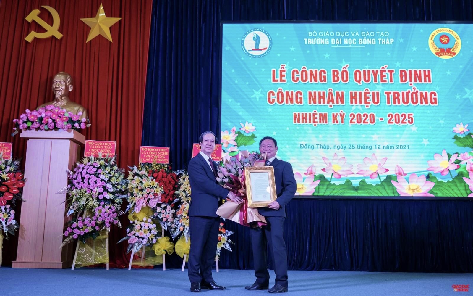 Bộ trưởng Nguyễn Kim Sơn trao quyết định công nhận Hiệu trưởng Trường Đại học Đồng Tháp nhiệm kỳ 2020-2025 cho thầy Hồ Văn Thống