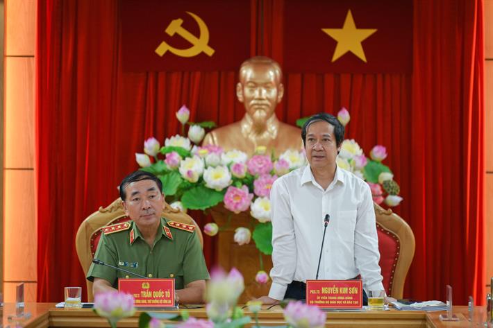 Phát biểu tại buổi làm việc, Bộ trưởng Bộ GDĐT Nguyễn Kim Sơn cảm ơn sự quan tâm của lãnh đạo Bộ Công an đối với công tác giáo dục, đào tạo, đặc biệt là sự hợp tác giữa hai Bộ trong suốt thời gian qua. Theo Bộ trưởng, Đề án 06 về ứng dụng dữ liệu về dân cư, định danh và xác thực điện tử do Bộ Công an chủ trì đã và đang có những hỗ trợ nhất định cho ngành giáo dục, trước mắt là việc đăng ký dự thi tốt nghiệp THPT năm 2022. Công tác phối hợp nhằm đảm bảo an toàn, an ninh cho kỳ thi tốt nghiệp THPT cũng được Bộ Công an quan tâm, tạo điều kiện hỗ trợ; công tác phối hợp trong đảm bảo an toàn trường học, phòng cháy chữa cháy trong các cơ sở giáo dục, phòng chống ma tuý, bạo lực học đường cũng được hai Bộ phối hợp nhịp nhàng, hiệu quả.