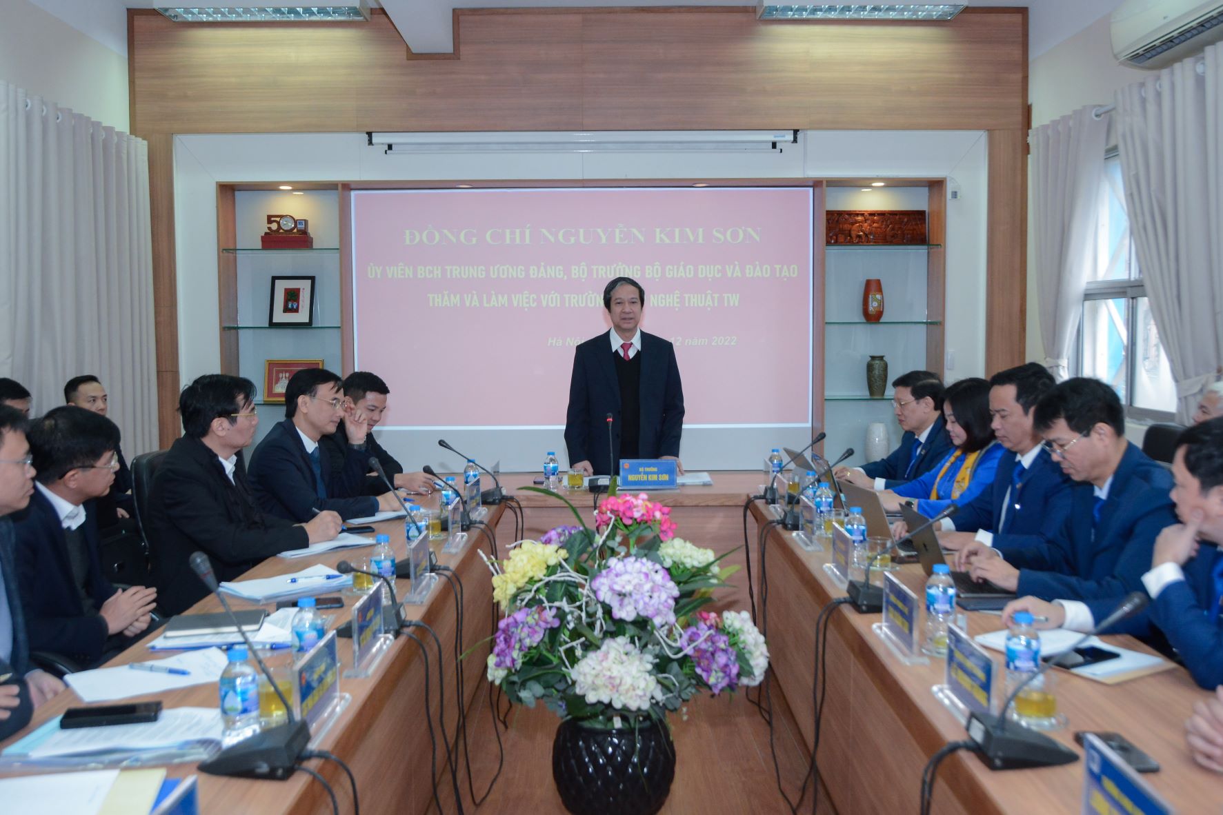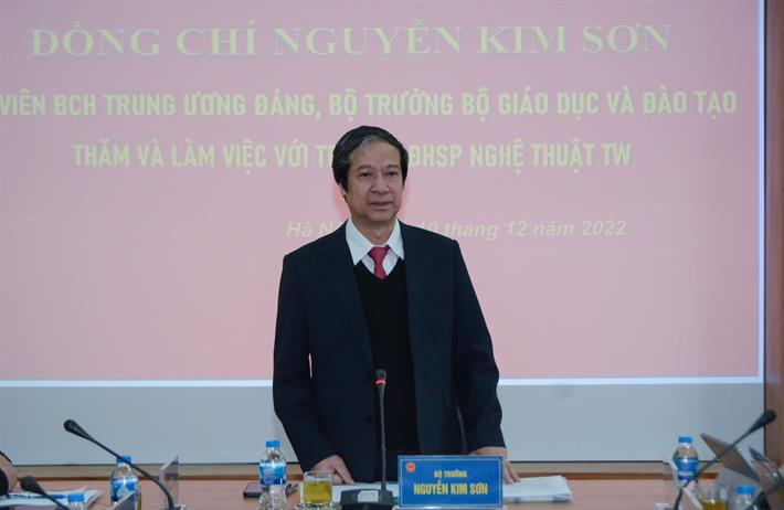 Ghi nhận những nỗ lực, kết quả đạt được của Trường Đại học Sư phạm Nghệ thuật Trung ương trong bối cảnh có nhiều khó khăn, thử thách đặt ra, Bộ trưởng Nguyễn Kim Sơn trong phát biểu với cán bộ, giảng viên nhà trường đã dành nhiều thời gian để chia sẻ về định hướng tương lai.
