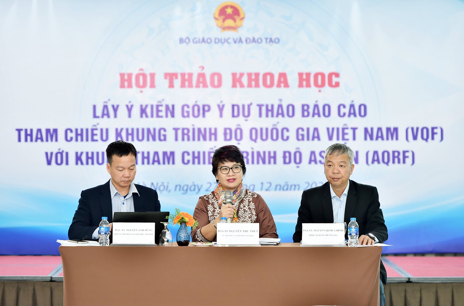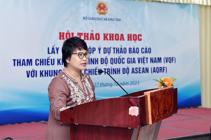 Phát biểu tại hội thảo, Vụ trưởng Vụ Giáo dục Đại học Nguyễn Thu Thuỷ cho biết: Dưới sự hướng dẫn của Ủy ban tham chiếu AQRF, sự góp ý trực tiếp của các chuyên gia trong nước và quốc tế, sự tham gia tích cực của các bên liên quan, đến nay Bộ GDĐT đã hoàn thiện việc xây dựng 6 tiêu chí đầu của báo cáo tham chiếu trong đó đã tích hợp cấu phần Giáo dục nghề nghiệp.