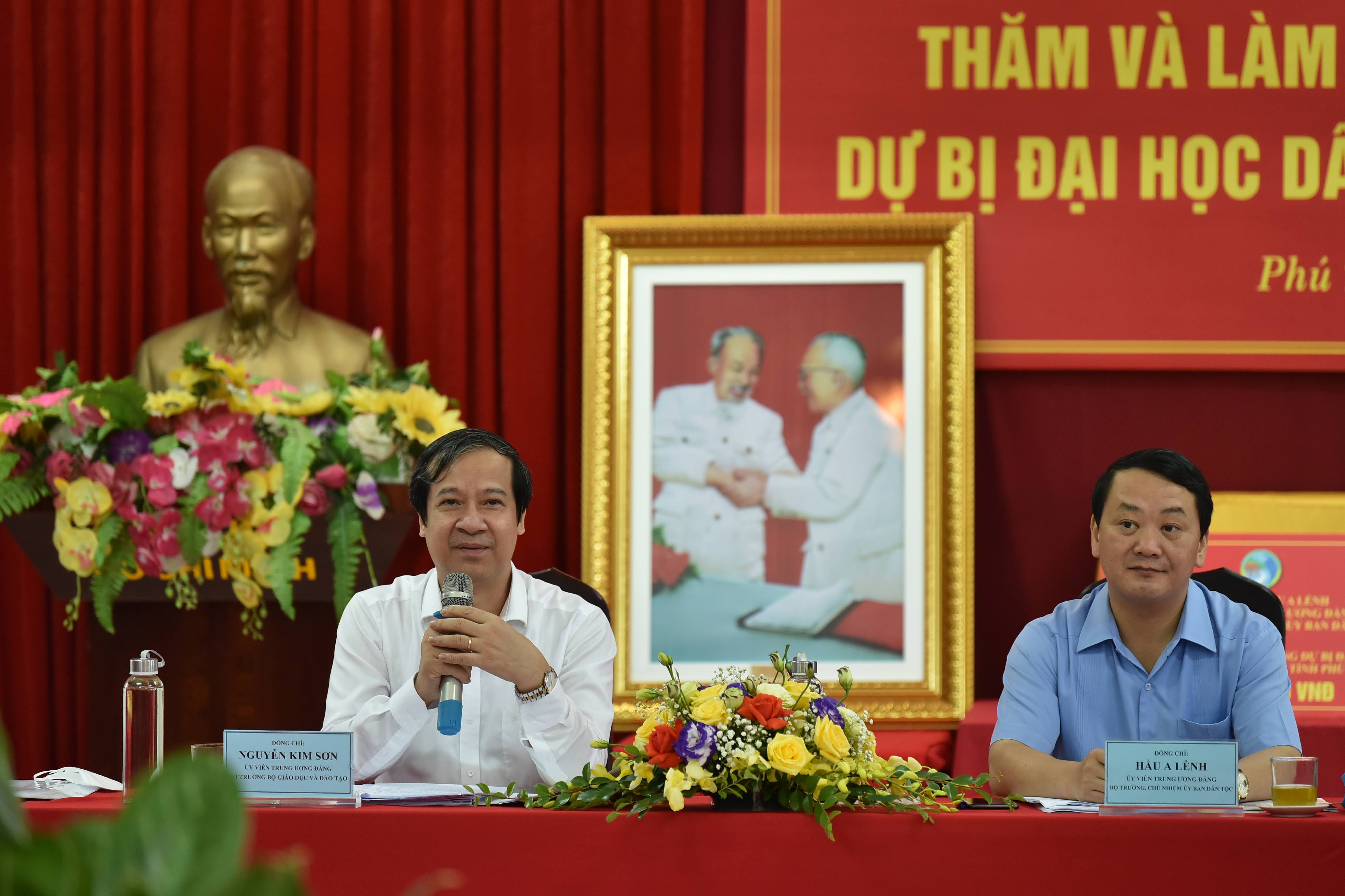 Trước đó, tới thăm và làm việc với cán bộ, giáo viên Trường Dự bị Đại học Dân tộc Việt Trì, Bộ trưởng Bộ GDĐT Nguyễn Kim Sơn và Bộ trưởng, Chủ nhiệm Ủy ban Dân tộc Hầu A Lềnh đã dành thời gian lắng nghe chia sẻ, nguyện vọng của cán bộ, giáo viên ở đây.