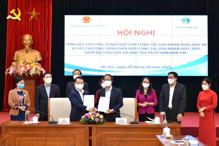 Hai Bộ trưởng cũng đồng thời khẳng định việc ký kết chương trình phối hợp công tác giai đoạn 2021-2025 giữa Bộ GDĐT, Ủy ban Dân tộc là hết sức cần thiết để tiếp tục triển khai những hoạt động cụ thể trong xây dựng, tổ chức triển khai các cơ chế chính sách, tạo điều kiện thuận lợi cho sự đổi mới và phát triển của giáo dục dân tộc, mang lại sự công bằng, bình đẳng trong tiếp cận giáo dục cho đồng dân tộc thiểu số.