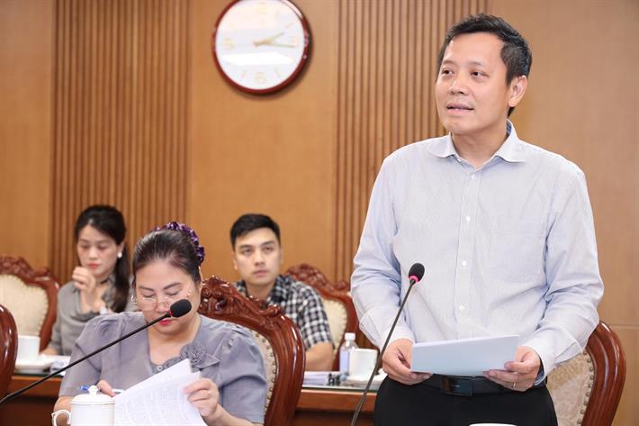 Vụ trưởng Vụ Giáo dục Mầm non Nguyễn Thanh Đề báo cáo tiến độ xây dựng tại phiên họp