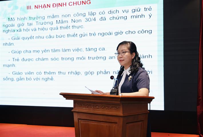 Bà Nguyễn Thị Thanh Toàn, Hiệu trưởng Trường mầm non 30/4 (TP.HCM) cho biết, trường nằm ven khu công nghiệp Vĩnh Lộc, từ năm 2016 đã thí điểm mô hình giữ trẻ ngoài giờ phục vụ con công nhân theo cơ chế Nhà nước – doanh nghiệp – phụ huynh cùng chia sẻ. Hiện nay, hoạt động được duy trì bằng mức phí 12.000 đồng/giờ, đáp ứng giờ tăng ca, giúp phụ huynh yên tâm làm việc, còn giáo viên có thêm thu nhập. Năm 2024, trường đã được công nhận Chuẩn quốc gia cấp độ 1 và Kiểm định chất lượng giáo dục cấp độ 2, khẳng định uy tín và hiệu quả của mô hình.