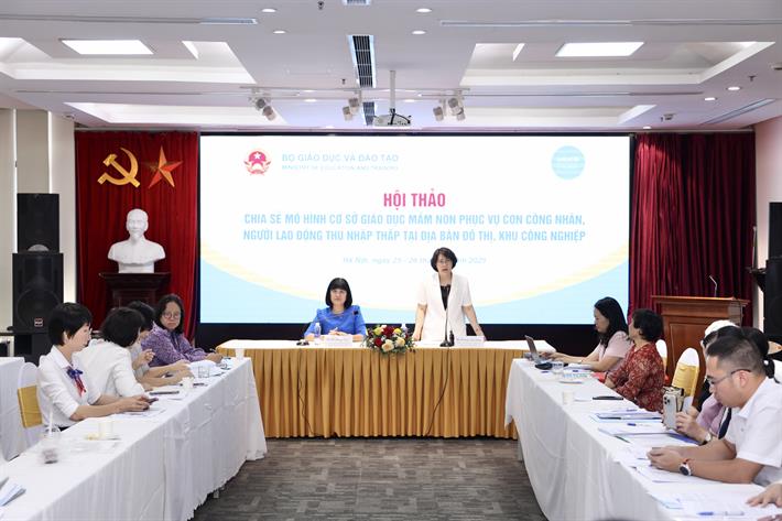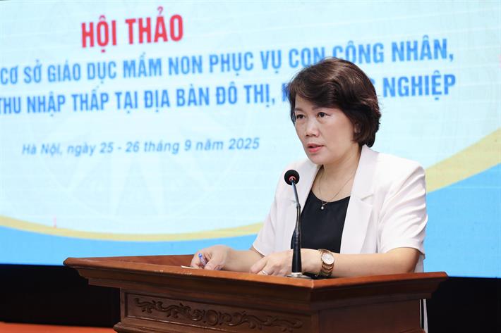 Phát biểu tại hội thảo, Phó Vụ trưởng Vụ Giáo dục mầm non Hoàng Thị Dinh cho biết, các đô thị và khu công nghiệp đang chứng kiến sự gia tăng nhanh chóng nhu cầu gửi trẻ mầm non của con công nhân và người lao động thu nhập thấp.