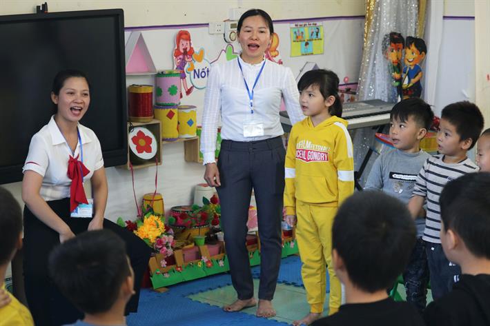 Chú trọng công tác bồi dưỡng đội ngũ, tăng cường tập huấn thực hành, bồi dưỡng phương pháp và kỹ năng tổ chức các hoạt động tăng cường tiếng Việt cho giáo viên. Chỉ đạo, sắp xếp đội ngũ giáo viên phù hợp, xen kẽ giáo viên người DTTS biết tiếng mẹ đẻ của trẻ và giáo viên người Kinh trong một nhóm lớp để tổ chức các hoạt động giáo dục đạt hiệu quả.