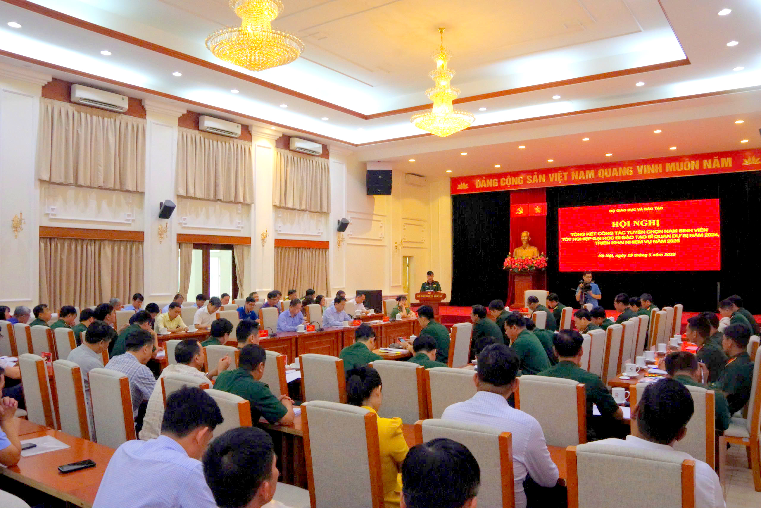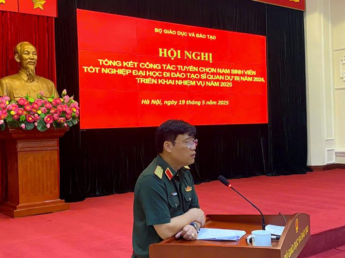 Sáng 19/5, tại Hà Nội, Bộ Giáo dục và Đào tạo (GDĐT) tổ chức Hội nghị tổng kết công tác tuyển chọn nam sinh viên tốt nghiệp đại học đi đào tạo sĩ quan dự bị (SQDB) năm 2024 và triển khai nhiệm vụ năm 2025. Thiếu tướng Trần Ngọc Thanh, Vụ trưởng Vụ Giáo dục Quốc phòng và An ninh (Bộ GDĐT) chủ trì hội nghị.