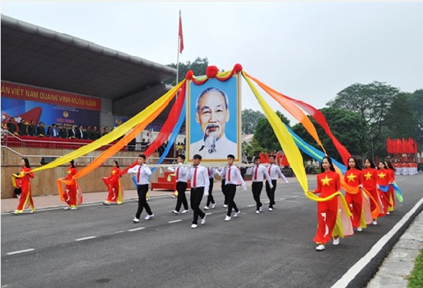Đội rước ảnh Bác Hồ diễu hành qua lễ đài