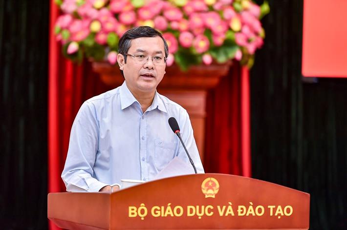 Vụ trưởng Vụ Giáo dục quốc phòng và an ninh Trần Ngọc Thanh báo cáo tại hội nghị