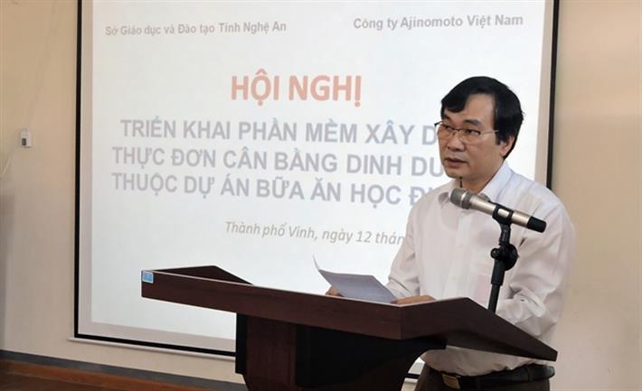 Tại Hội nghị triển khai Phần mềm tại Nghệ An, TS. Ngũ Duy Anh – Vụ trưởng Vụ Giáo dục Thể chất đã yêu cầu Sở Giáo dục và Đào tạo Nghệ An cần bám sát kế hoạch triển khai, nội dung và cách thức thực hiện Phần mềm dinh dưỡng sẽ được phổ biến trong Hội nghị này; từ đó phối hợp chặt chẽ với Công ty Ajinomoto triển khai thành công Phần mềm tại các trường tiểu học có tổ chức bán trú tại địa phương.