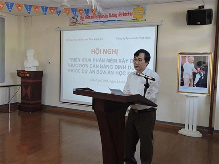 Tại Hội nghị triển khai Phần mềm tại Nghệ An, TS. Ngũ Duy Anh – Vụ trưởng Vụ Giáo dục Thể chất đã yêu cầu Sở Giáo dục và Đào tạo Nghệ An cần bám sát kế hoạch triển khai, nội dung và cách thức thực hiện Phần mềm dinh dưỡng sẽ được phổ biến trong Hội nghị này; từ đó phối hợp chặt chẽ với Công ty Ajinomoto triển khai thành công Phần mềm tại các trường tiểu học có tổ chức bán trú tại địa phương.