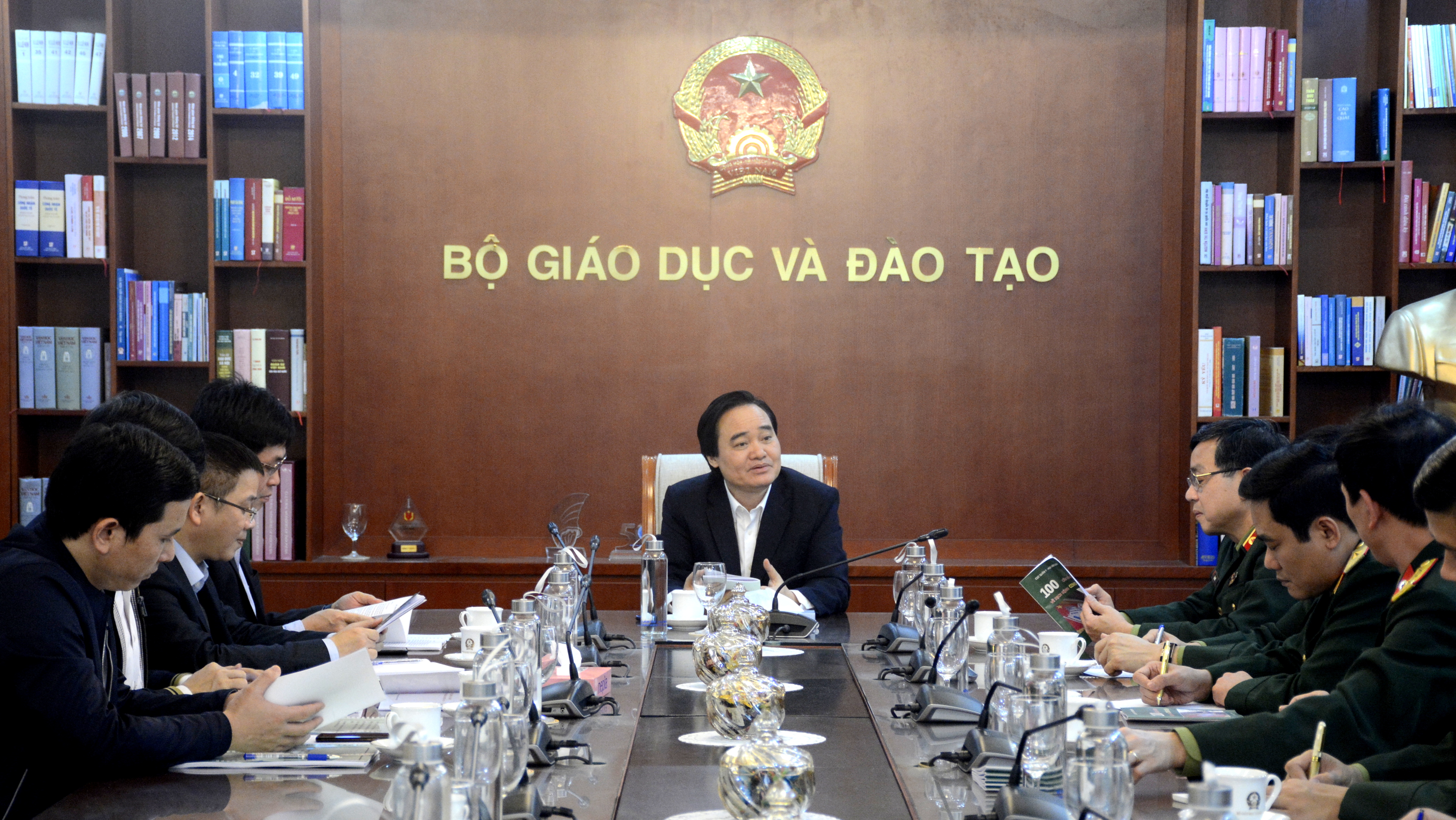 Bộ trưởng Phùng Xuân Nhạ trao đổi với lãnh đạo Học viện Quân Y về việc xây dựng hướng dẫn quy trình phòng, chống Covid-19 trong trường học