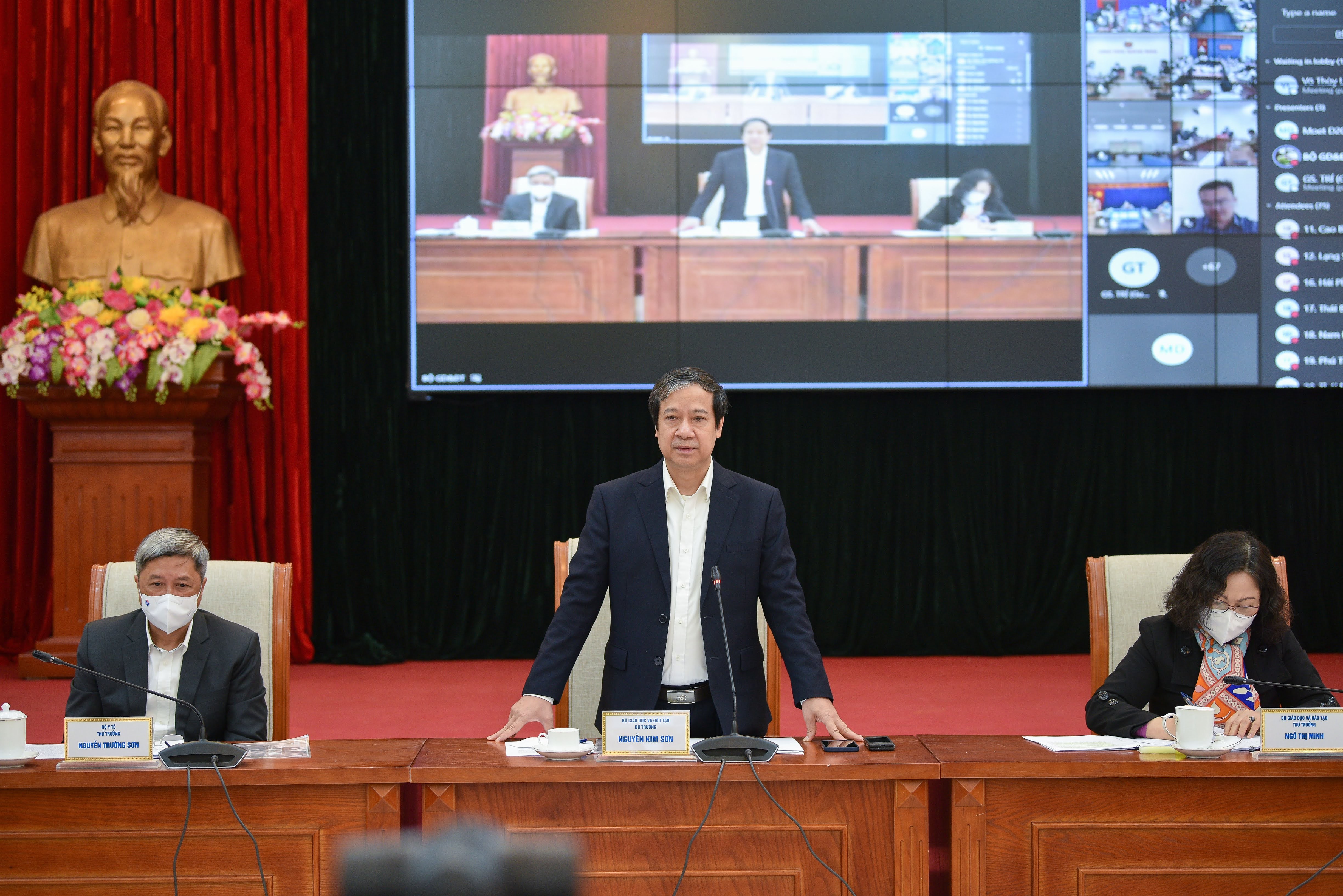 Cùng dự có Thứ trưởng Bộ Y tế Nguyễn Trường Sơn; Thứ trưởng Bộ GDĐT Ngô Thị Minh; đại diện Vụ Khoa giáo Văn xã, Văn phòng Chính phủ; lãnh đạo mọt số đơn vị thuộc Bộ Y tế, Bộ GDĐT; các chuyên gia, các nhà khoa học, đại diện các tổ chức quốc tế. Tại các điểm cầu 63 tỉnh thành có Chủ tịch, Phó Chủ tịch UBND các tỉnh thành phố; Giám đốc, Phó giám đốc các sở GDĐT, sở Y tế, các sở ngành liên quan của địa phương, lãnh đạo UBND cấp quận huyện.
