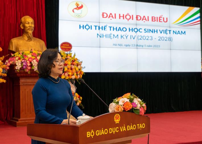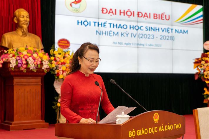 Thứ trưởng Bộ GDĐT Ngô Thị Minh, Chủ tịch Hội Thể thao học sinh Việt Nam nhiệm kỳ IV phát biểu tại Đại hội