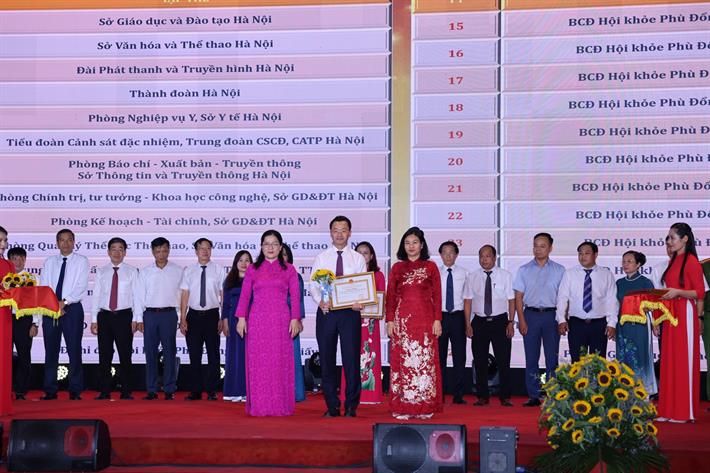 Thứ trưởng Nguyễn Thị Kim Chi và Phó Bí thư Thành uỷ Hà Nội Nguyễn Thị Tuyến trao Bằng khen của UBND thành phố cho tập thể xuất sắc trong công tác tổ chức Hội khỏe Phù Đổng