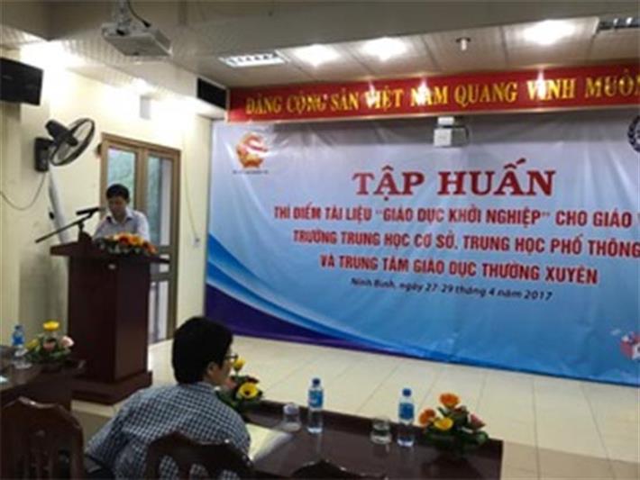Thực hiện Kế hoạch công tác năm 2017, từ ngày 27/4 đến ngày 29/4/2017, tại Trung tâm GDTX tỉnh Ninh Bình, Vụ Giáo dục thường xuyên, Bộ GDĐT phối hợp với Tổ chức Lao động Quốc tế ILO và Sở GDĐT tỉnh Ninh Bình tổ chức tập huấn thí điểm tài liệu “Giáo dục khởi nghiệp” hơn 60 giáo viên các trường trung học cơ sở, trung học phổ thông và trung tâm giáo dục thường xuyên trên địa bàn tỉnh Ninh Bình. Tham dự lớp tập huấn có ông Phạm Sỹ Bỉnh - Phó Vụ trưởng Vụ Giáo dục Thường xuyên,, bà Nguyễn Mai Oanh - Đại diện văn phòng Tổ chức Lao động Quốc tế ILO tại Việt Nam, đại diện lãnh đạo Sở GDĐT Ninh Bình và các học viên tham gia tập huấn.