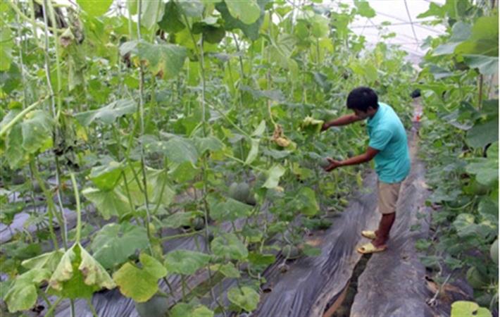 Nông dân Vị Xuyên chăm sóc cây dưa trong mô hình nhà lưới