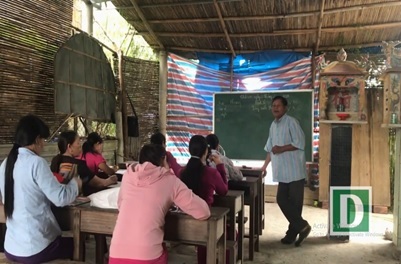 Thầy Hòa đang đứng giảng bài trong "phòng học" che bằng phên nứa và bạt nylon ở nhà