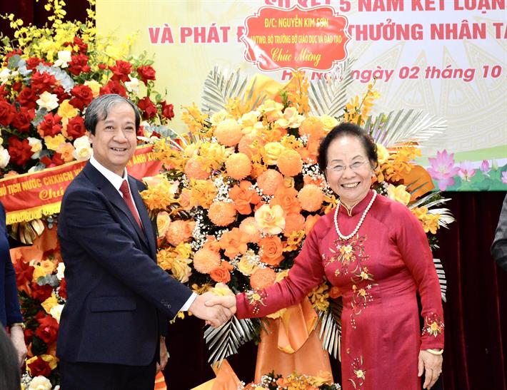 Bộ trưởng Nguyễn Kim Sơn chúc mừng GS.TS Nguyễn Thị Doan, Chủ tịch Hội Khuyến học Việt Nam