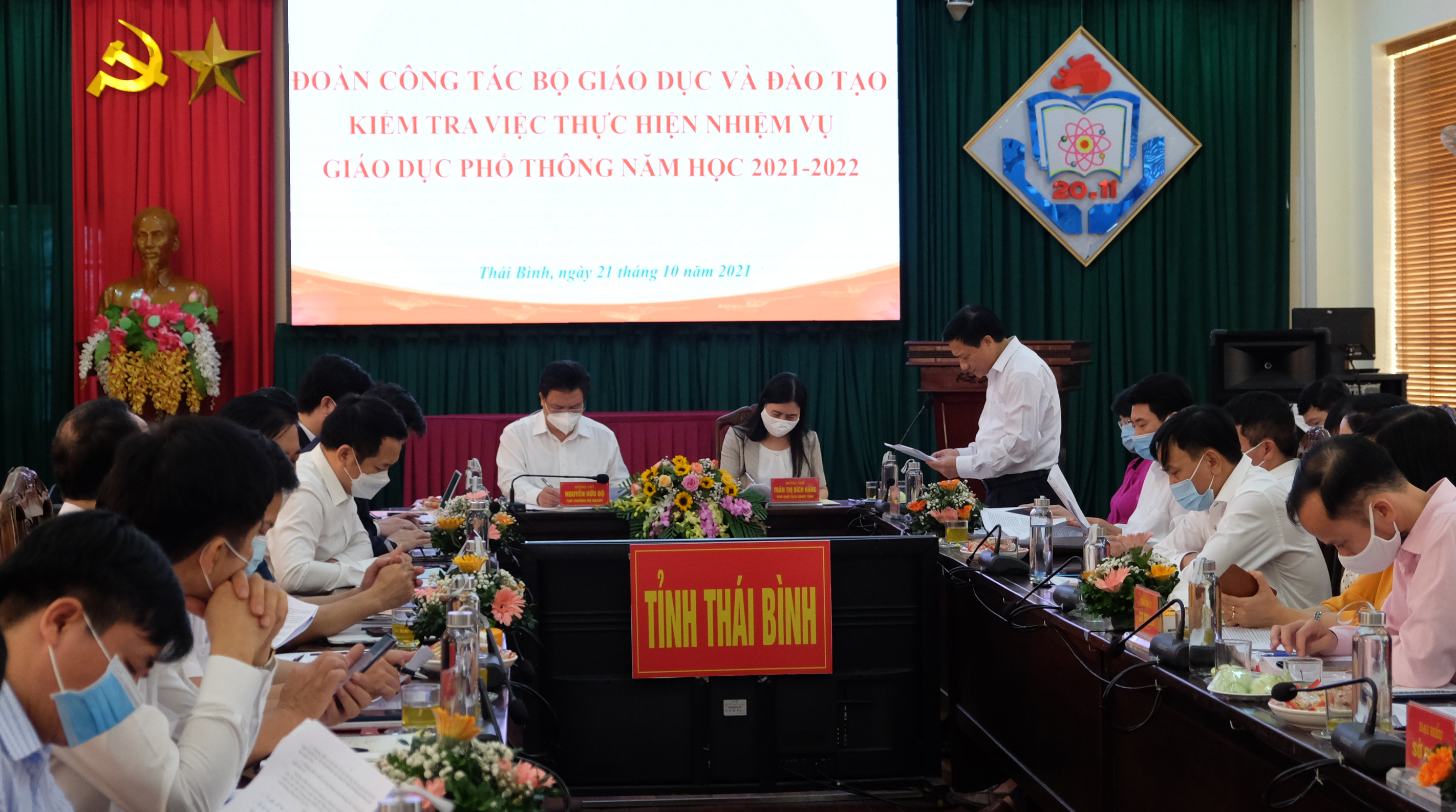 Báo cáo đoàn công tác, Giám đốc Sở GDĐT Thái Bình Nguyễn Viết Hiển cho biết, việc dạy học CT GDPT 2018 đối với lớp 1, lớp 2 và lớp 6 của các cơ sở giáo dục trên địa bàn tỉnh diễn ra khá thuận lợi. Tất cả giáo viên dạy các lớp này đều đã được bồi dưỡng kỹ lưỡng về chương trình, sách giáo khoa mới. Sở GDĐT cụ thể hoá các hướng dẫn chuyên môn được Bộ GDĐT ban hành để phù hợp với điều kiện của địa phương và chỉ đạo Phòng GDĐT hướng dẫn các nhà trường thực hiện. Với cách làm này, các nhà trường đã được chủ động, linh hoạt và thuận lợi trong xây dựng, điều chỉnh kế hoạch giáo dục nhà trường, kế hoạch dạy học từng môn học phù hợp với các giai đoạn phòng chống dịch.