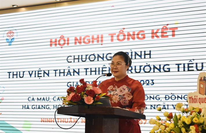 Phó Vụ trưởng Vụ Giáo dục Tiểu học, Trưởng Ban điều phối chương trình “Thư viện thân thiện trường tiểu học” cấp Bộ Trịnh Hoài Thu phát biểu tại Hội nghị