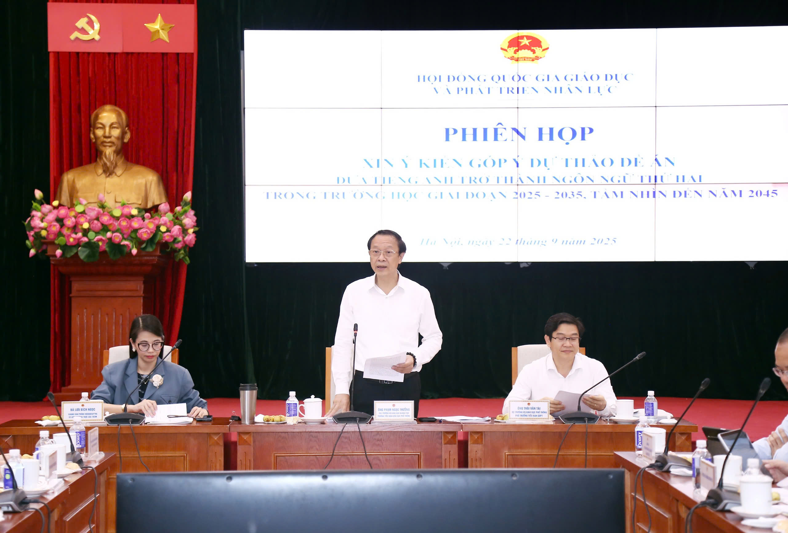 Ngày 22/9, tại Hà Nội, Hội đồng Quốc gia Giáo dục và Phát triển nhân lực tổ chức phiên họp xin ý kiến góp ý dự thảo Đề án “Đưa tiếng Anh thành ngôn ngữ thứ hai trong trường học giai đoạn 2025-2035, tầm nhìn đến năm 2045” (sau đây gọi là Đề án). Thứ trưởng Thường trực Bộ Giáo dục và Đào tạo (GDĐT) Phạm Ngọc Thưởng, Trưởng Tiểu ban Giáo dục phổ thông chủ trì phiên họp.