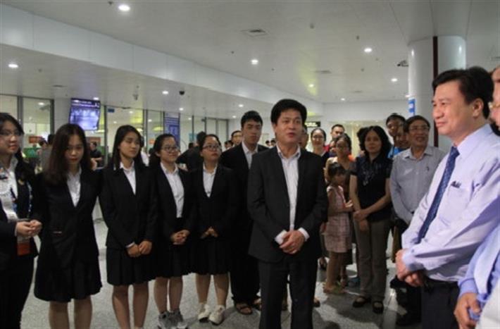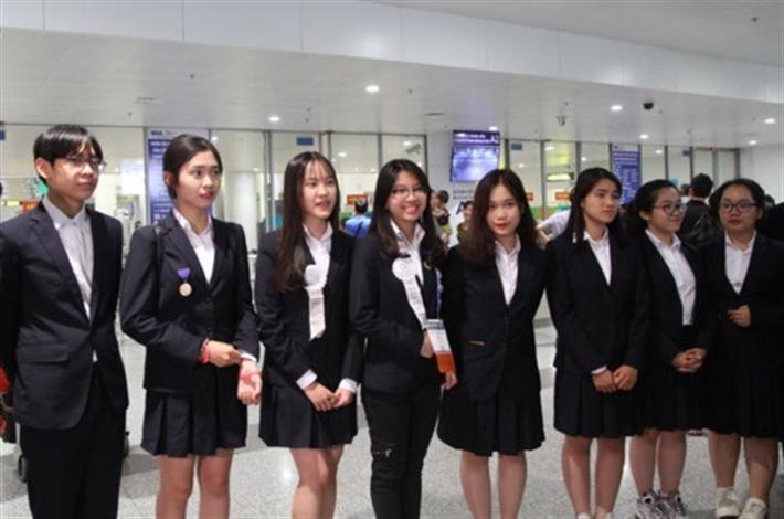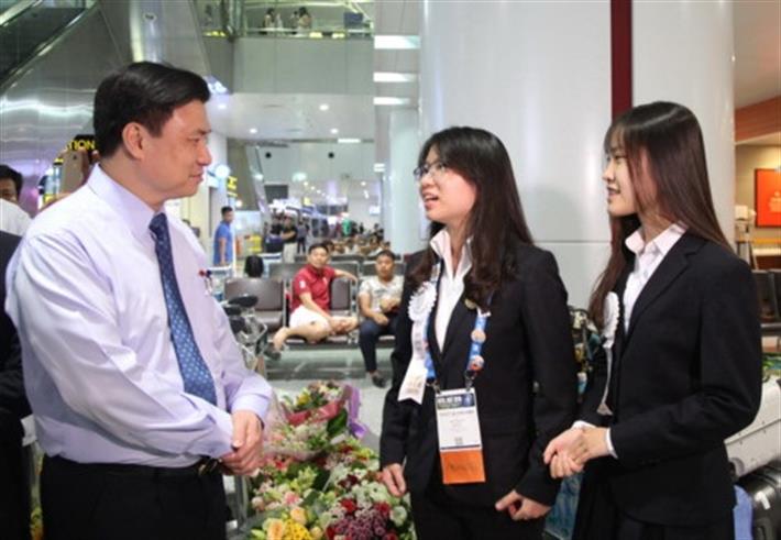 Đón đoàn tại sân bay quốc tế Nội Bài có Thứ trưởng Bộ GD&ĐT Nguyễn Hữu Độ, lãnh đạo các đơn vị chức năng của Bộ GD&ĐT, lãnh đạo các sở GD&ĐT có học sinh dự thi.