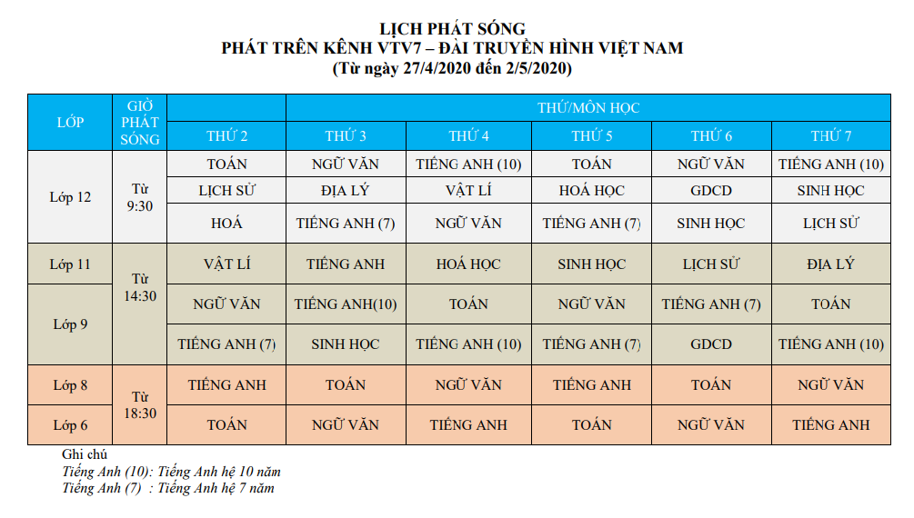 Lịch phát sóng dạy học trên truyền hình VTV7 (Từ ngày 27/4 đến 02/5/2020)